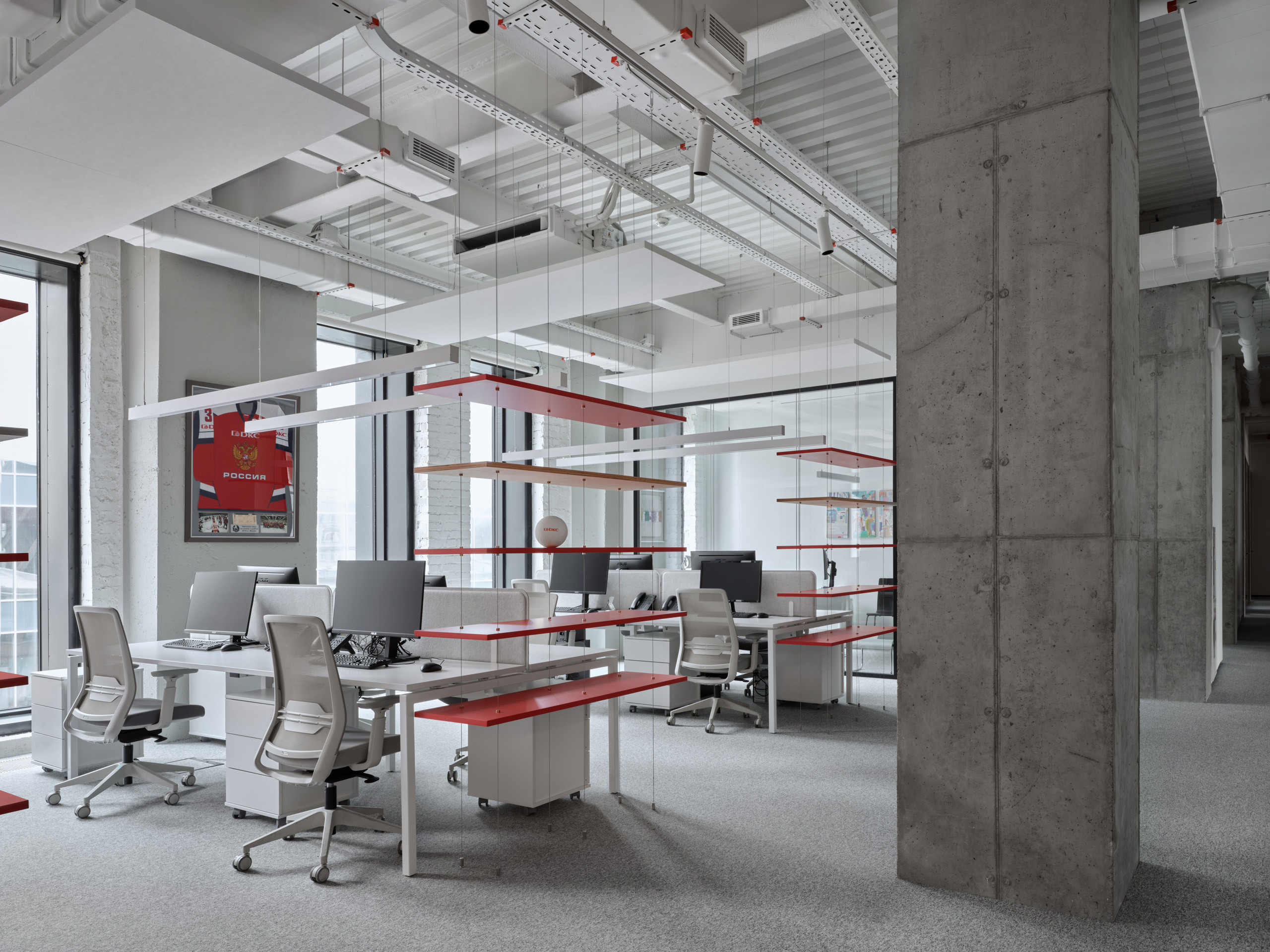 Особое внимание было уделено организации рабочих мест. Над каждой зоной на два рабочих места, составляющих единую линию, размещен линейный подвесной светильник с широкой оптикой, соответствующий длине стола. Профессиональная оптика не дает бликов, обеспечивая визуальный комфорт при нормируемом уровне освещенности. Линейные подвесные светильники гармонируют с подвесными полками, визуально составляя единый комплект элементов интерьера, соответствуя дизайнерским решениям. Мобильные рабочие места, расположенные вдоль окон рабочей зоны, освещаются поворотными трековыми прожекторами, обеспечивающими общее освещение. Чтобы создать комфортное и функциональное освещение на этих рабочих местах, они были укомплектованы персональными настольными светильниками, которые сотрудники могут использовать при необходимости.