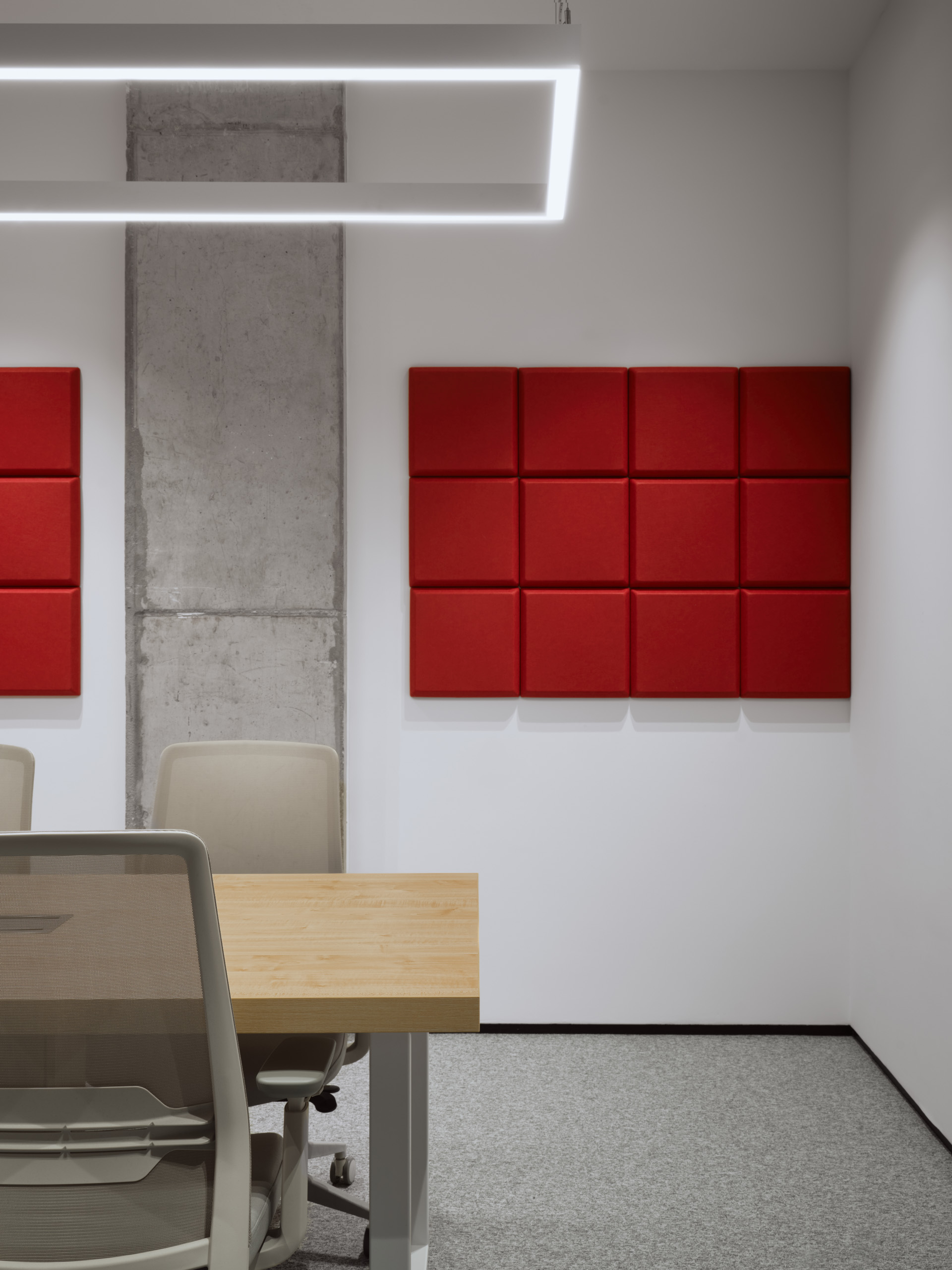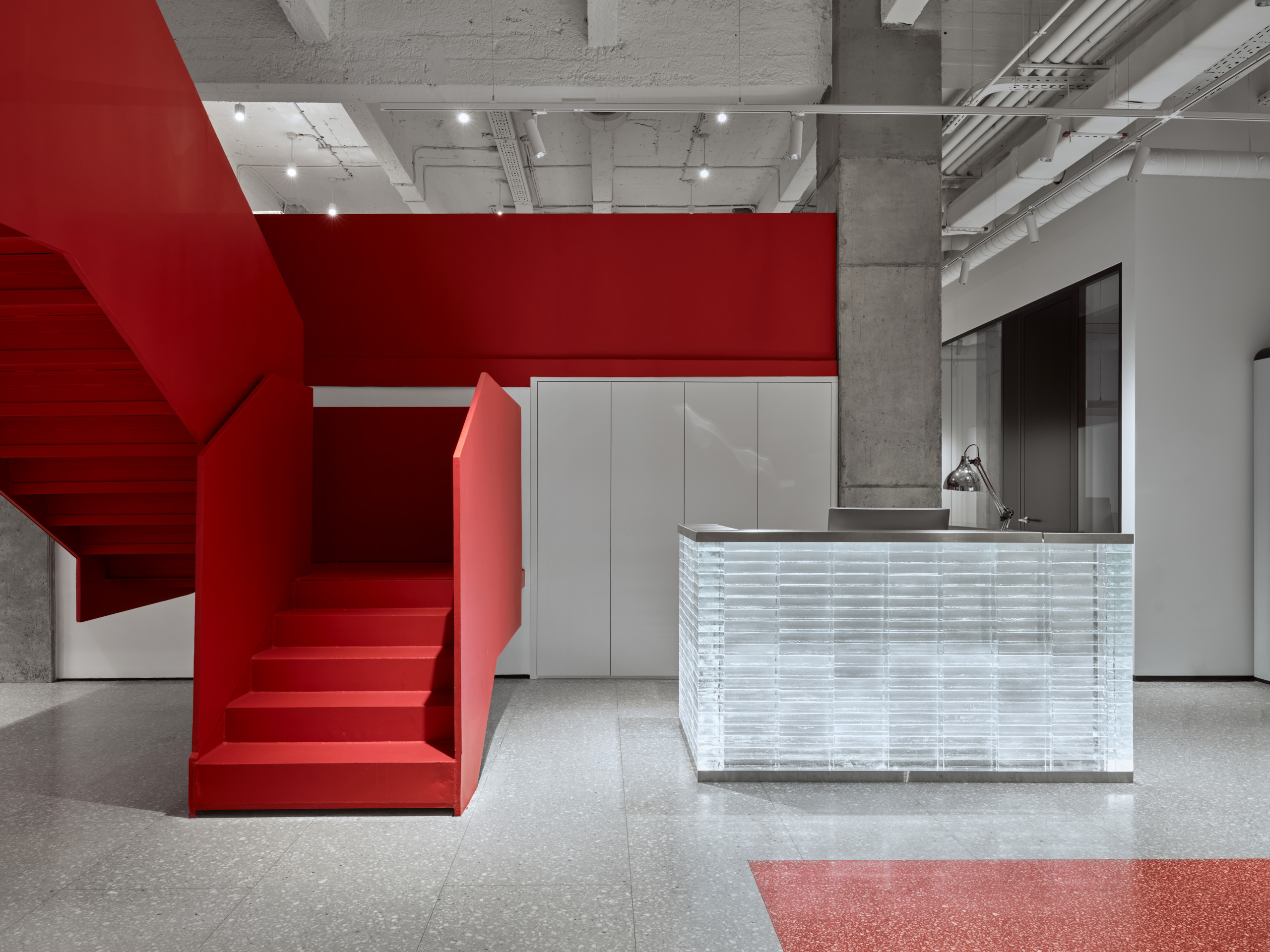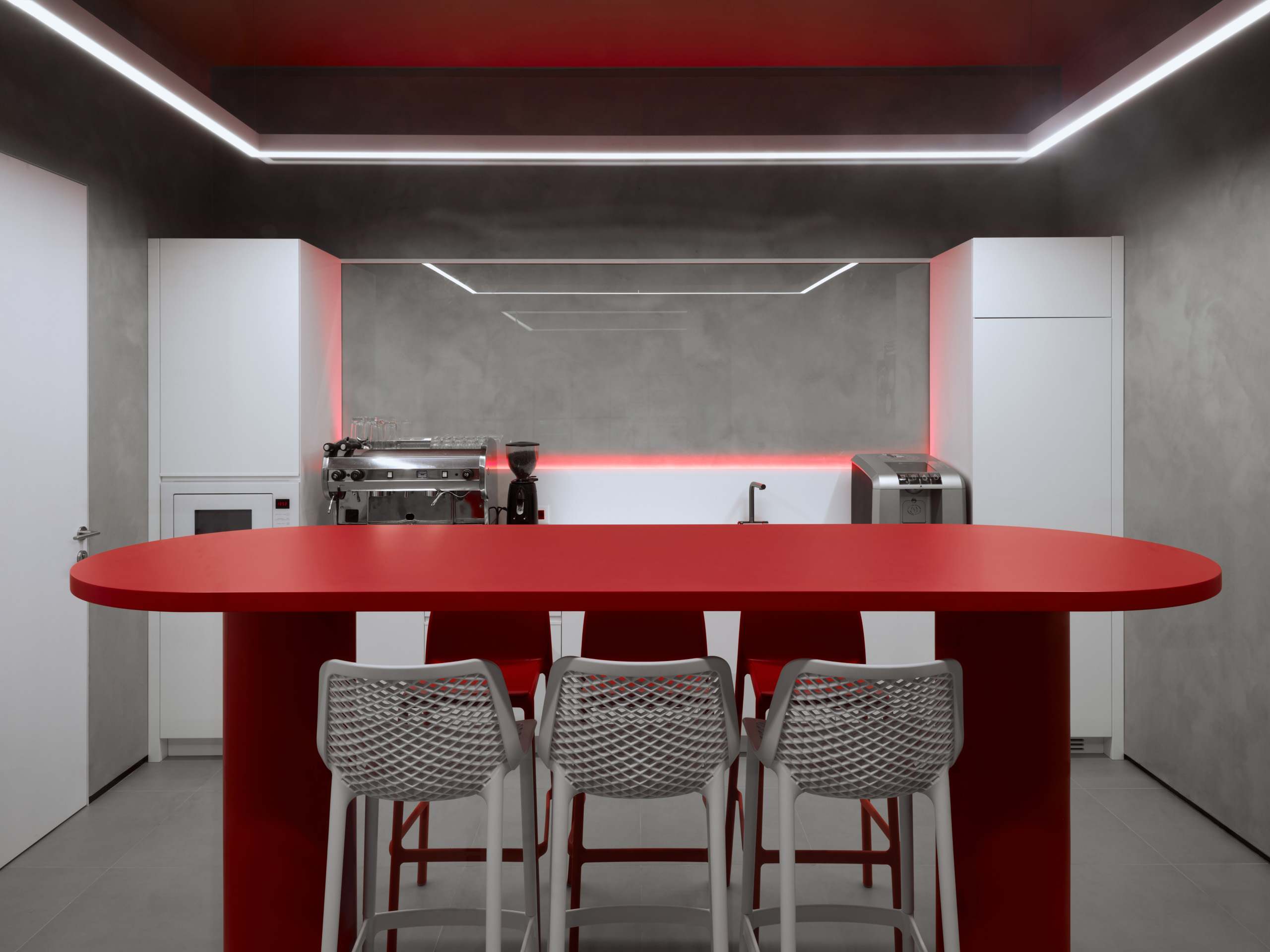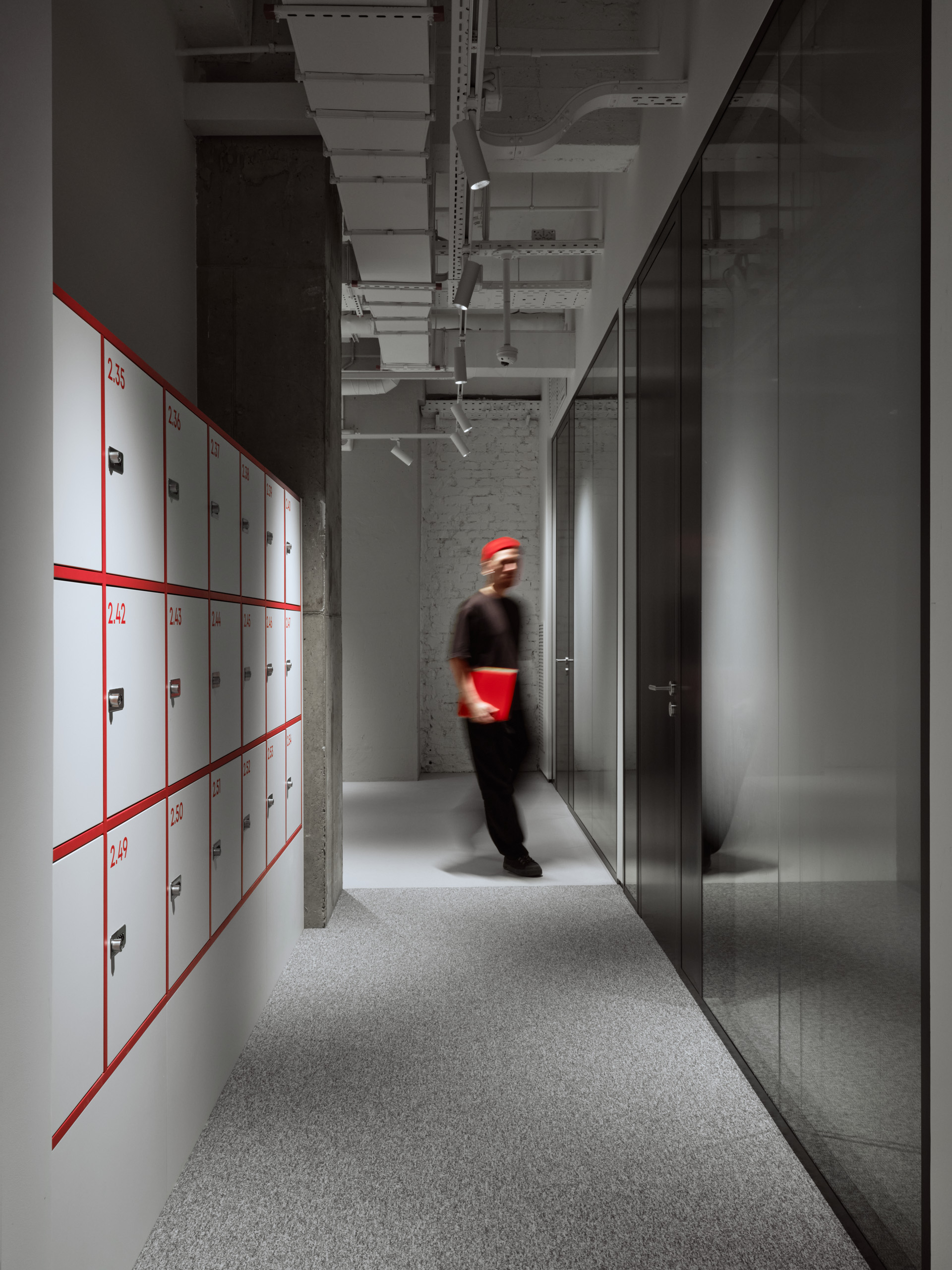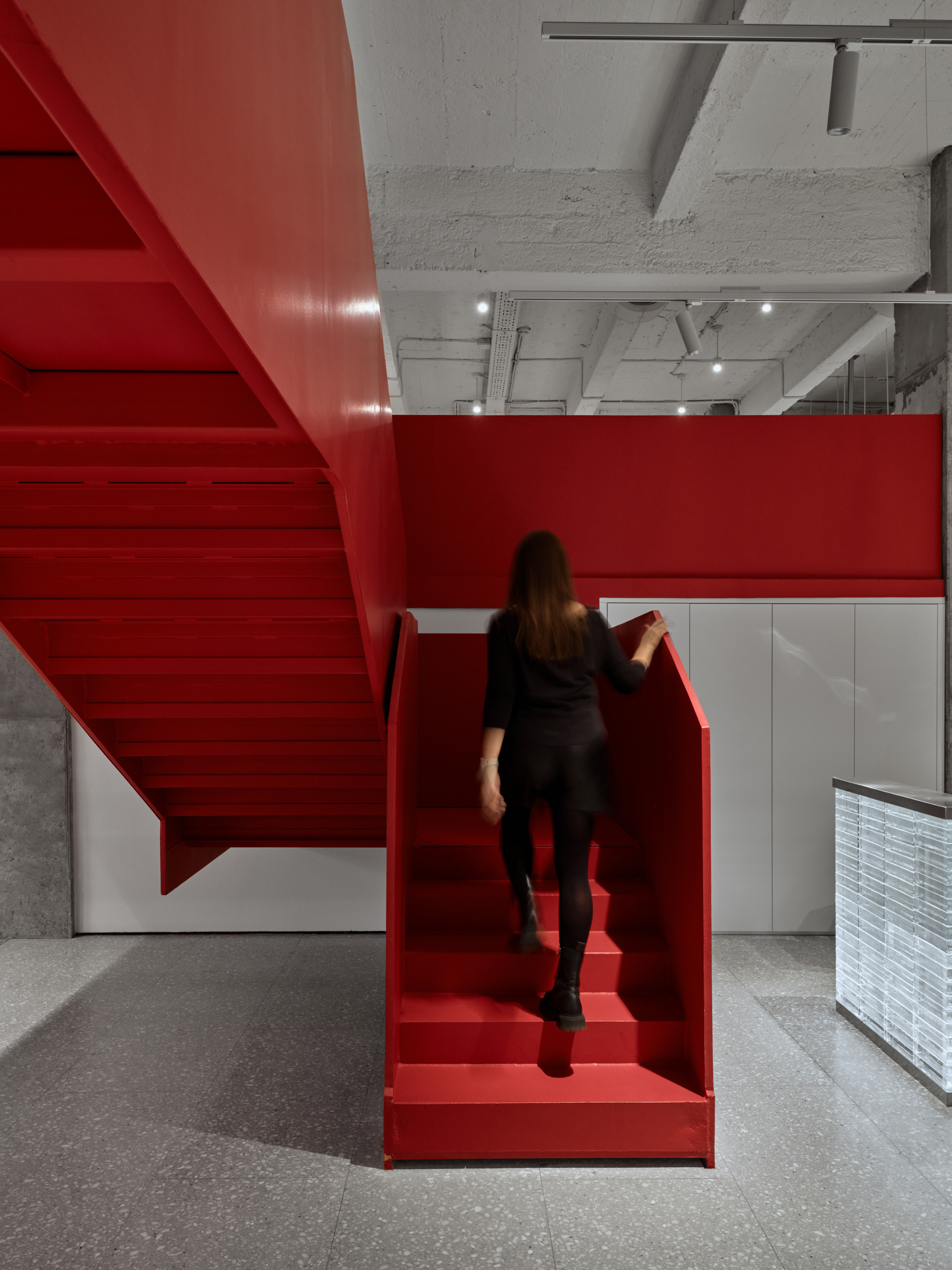 В интерьере офиса авторы сочетают прямые геометричные линии и грубый материал отделки с более мягкими округлыми формами и цветовыми акцентами, что помогает сформировать баланс как в архитектуре, так и в восприятии пространства.